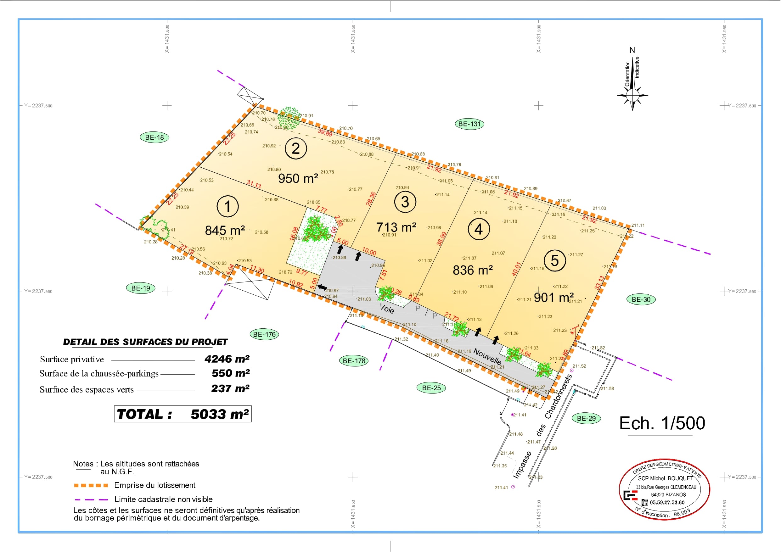 Le lotissement « Les Chardonnerets » se compose de 5 terrains à bâtir, aux superficies allant de 713 m² à 950 m². Ces parcelles sont libres de constructeur, entièrement viabilisées, et offrent un environnement calme et résidentiel, idéal pour une vie de famille.