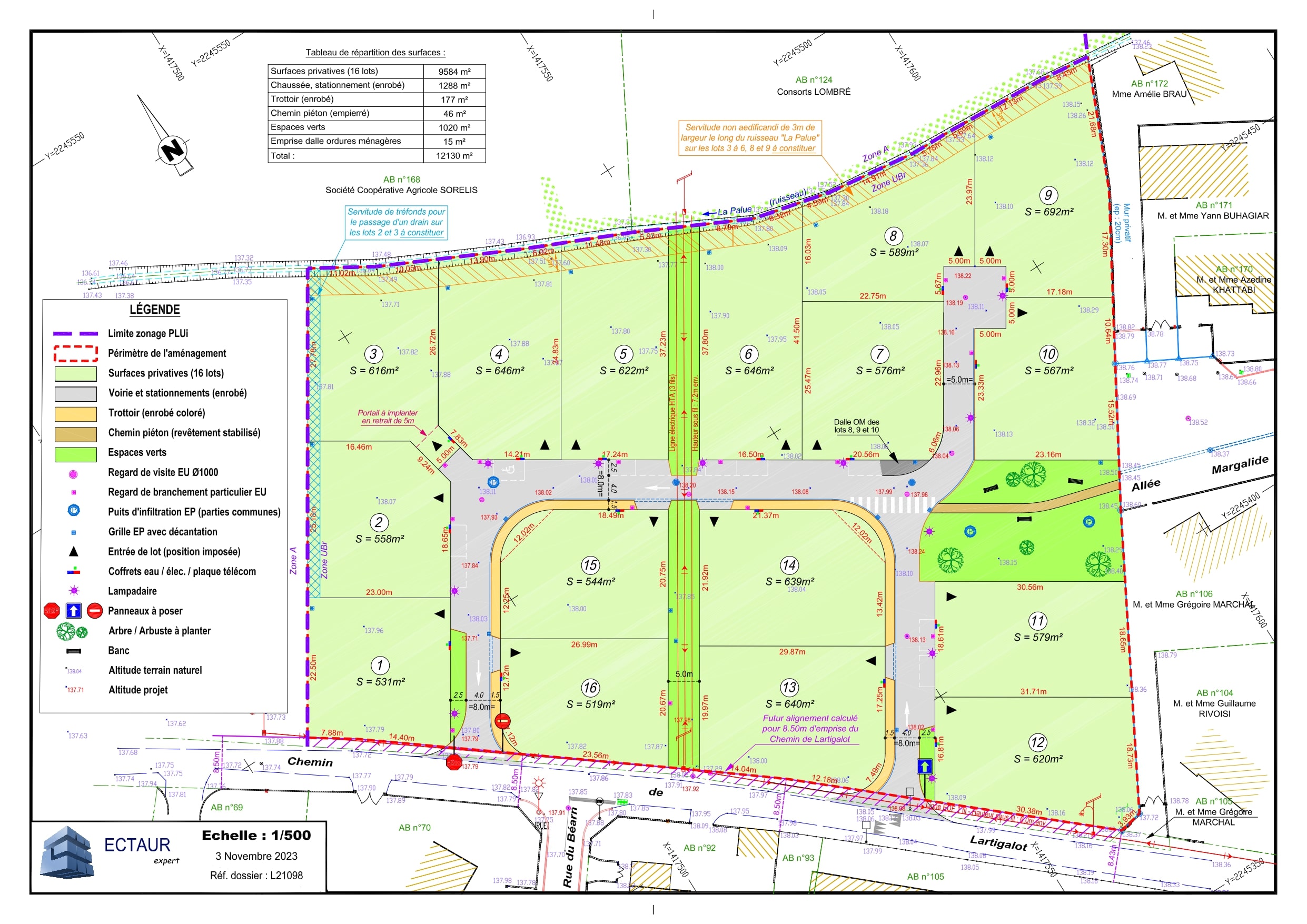 Le lotissement « Lartigalot » est composé de 16 terrains à bâtir, entièrement viabilisés (eau potable, électricité, tout-à-l’égout), allant de 519 m² à 692 m². Les lots sont libres de constructeurs, vous permettant ainsi de concrétiser votre projet immobilier selon vos envies et vos besoins.
